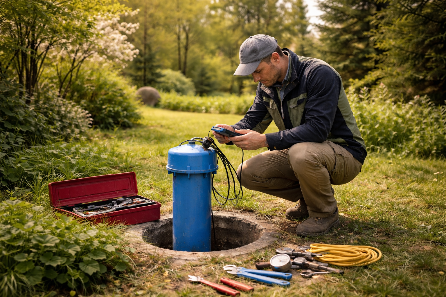 Podczas pracy pompy słuchaj dźwięków. Nietypowe hałasy mogą oznaczać zużycie. Jeśli nie masz pewności, nie rozbieraj urządzeń sam. Fachowiec oceni stan, sprawdzi wydajności i wykona potrzebne prace przy studni głębinowej i instalacji.